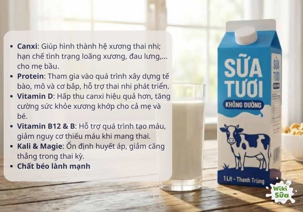 Sữa tươi là nguồn cung cấp nhiều dưỡng chất thiết yếu, hỗ trợ sức khỏe mẹ bầu và sự phát triển toàn diện của thai nhi trong suốt thai kỳ. Trong sữa tươi chứa các thành phần dinh dưỡng quan trọng như: