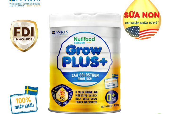 Sữa bột Nutifood GrowPLUS+ Sữa Non Vàng 1+ 800g Trên 1 Tuổi là sản phẩm dinh dưỡng cao cấp, được thiết kế dành riêng cho trẻ trên 1 tuổi, bổ sung cùng chế độ ăn và sữa mẹ. Sản phẩm thuộc thương hiệu Nutifood Thụy Điển, phát triển với công thức độc quyền FDI (Foundation of Digestion & Immunity), xây dựng nền tảng đề kháng khỏe, tiêu hóa tốt và hấp thu dưỡng chất hiệu quả. Điểm nổi bật của sản phẩm là bổ sung 100% sữa non 24h tự nhiên từ Mỹ với hàm lượng kháng thể IgG cao đến 1000 mg, kết hợp cùng 2’-FL HMO, mang lại khả năng tăng cường sức đề kháng tối ưu, giúp trẻ phát triển khỏe mạnh toàn diện. Sản phẩm được sản xuất tại Singapore dưới sự giám sát và tiêu chuẩn chất lượng nghiêm ngặt của Nutifood Thụy Điển, đảm bảo an toàn và chất lượng cao.